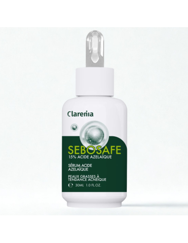 Le sérum Clarenia SeboSafe Azélaïque est formulé avec 15% d’acide azélaïque, reconnu pour son efficacité sur les peaux grasses à tendance acnéique. Grâce à ses propriétés antibactériennes, kératolytiques et anti-inflammatoires, il réduit les imperfections, régule l’excès de sébum et favorise l’atténuation des marques post-acné et taches pigmentaires. Dès 7 jours, la peau paraît plus lisse, le grain de peau est affiné et les marques s’estompent progressivement. Sa tolérance élevée en fait un soin adapté même aux peaux sensibles.