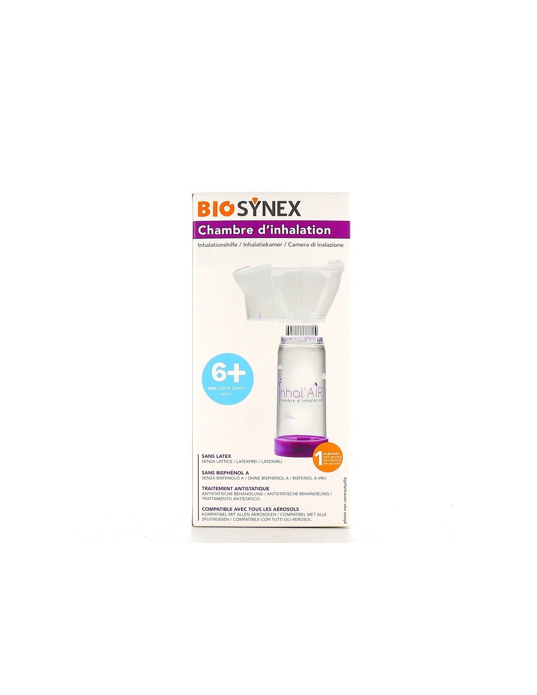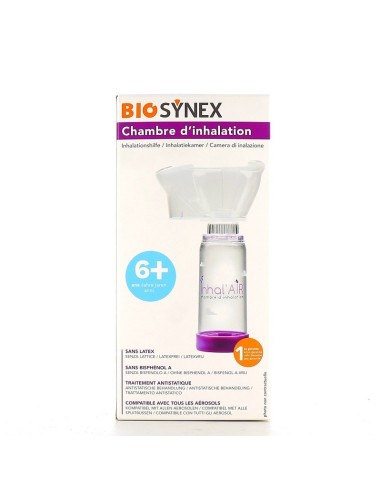La chambre d'inhalation Biosynex permet de faciliter l'inhalation d'un traitement par aérosol doseur via embout buccal et d'éviter les erreurs de coordination. De plus elle permet d'augmenter l'inhalation du médicament dans les poumons grâce à la diminution de la vitesse des particules.