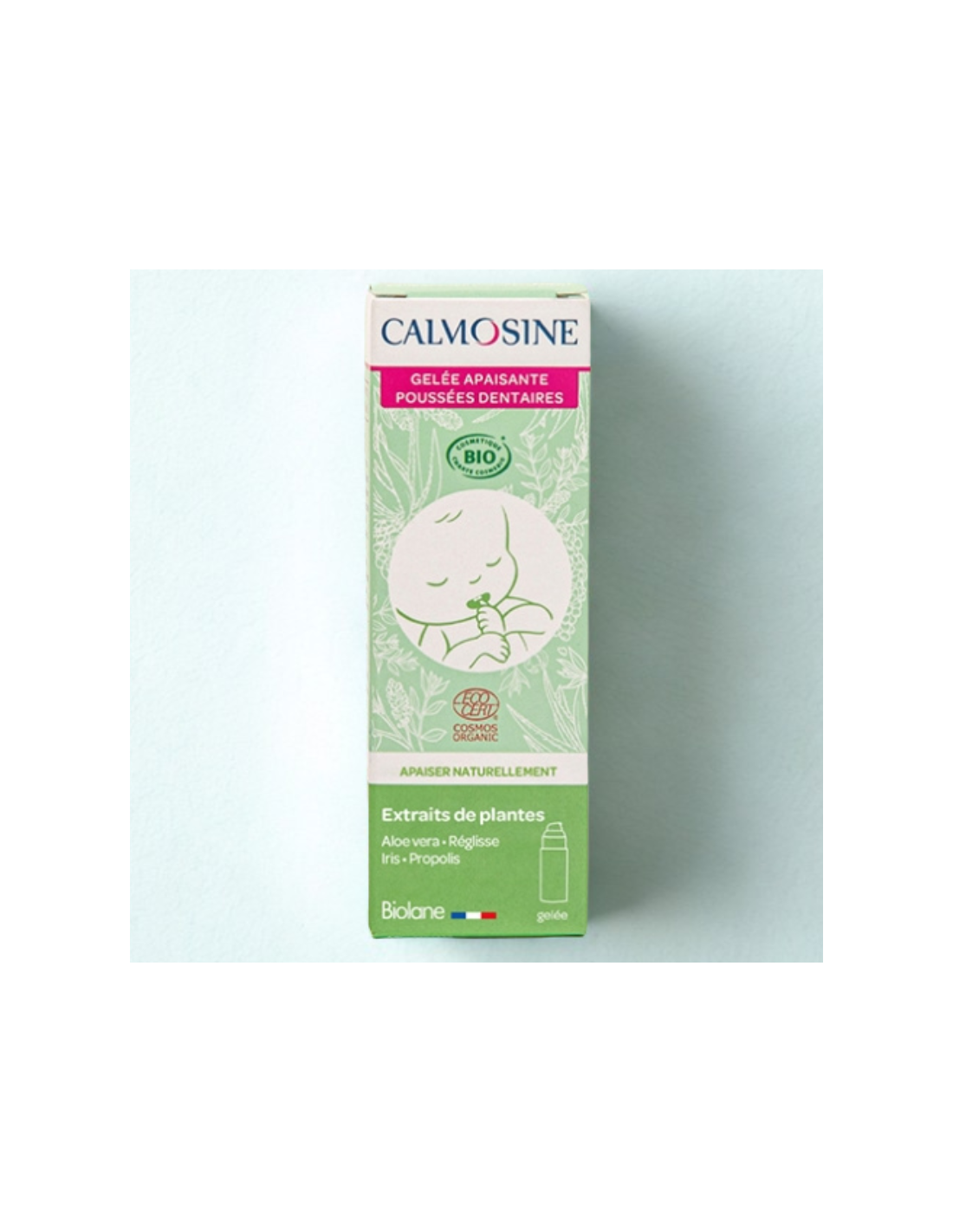 Calmosine Gelée Apaisante Poussées Dentaires Bio 15 ml est une gelée apaisante aux extraits végétaux (Aloe Vera, Réglisse, Iris) et à la propolis, qui diminue les inconforts liés aux poussées dentaires et facilite la sortie des premières dents par son action apaisante sur les gencives de bébé.
