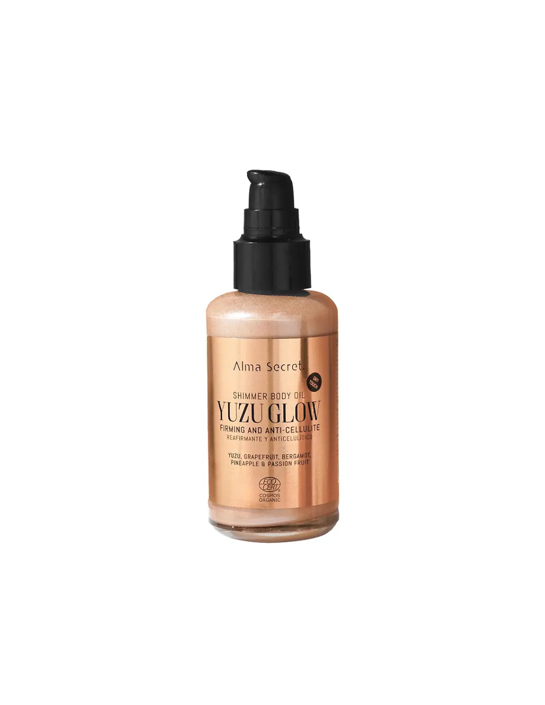Huile corps illuminatrice YUZU GLOW : nourrit, raffermit, réduit cellulite & vergetures, sublime la peau avec un fini satiné et des reflets champagne bronze.
