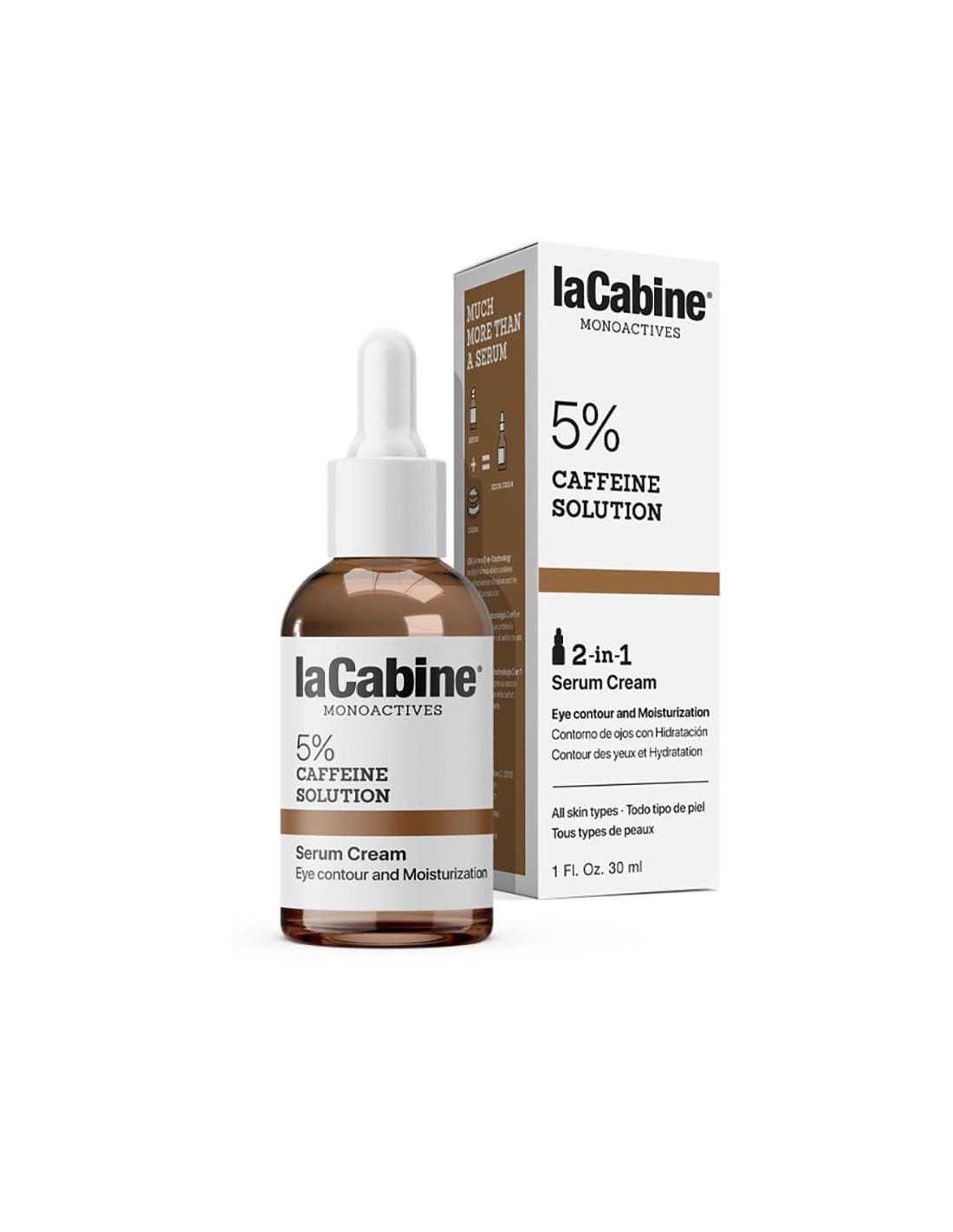Sérum Crème 2 en 1 avec 5% de caféine en solution, aide à réduire les poches et les cernes tout en hydratant. En une seule étape, votre regard est intensément revitalisé.