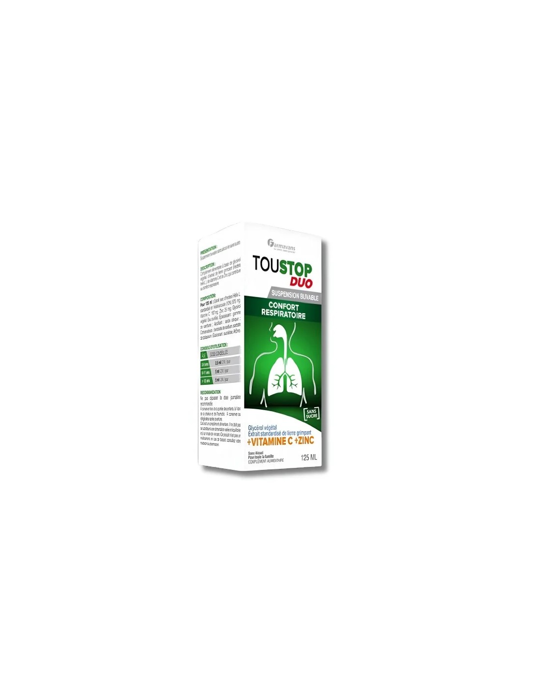 TOUSTOP DUO est une suspension orale formulée pour soutenir le confort respiratoire, notamment en période de toux, de rhume ou de voies respiratoires encombrées.