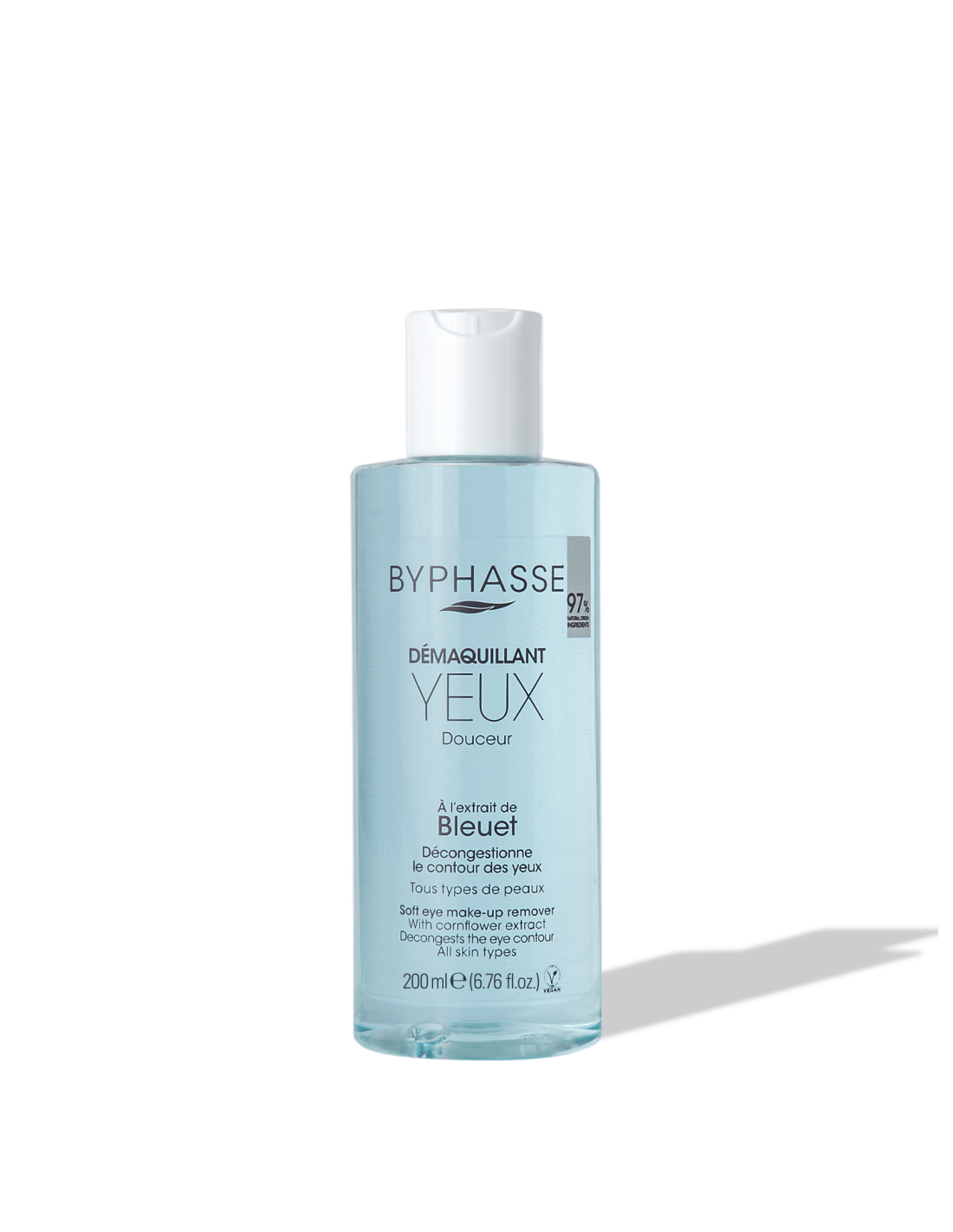 Le démaquillant yeux Douceur Byphasse à l’extrait de bleuet, nettoie en douceur et élimine efficacement le maquillage.