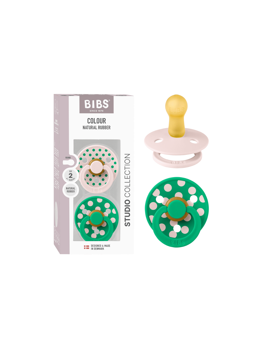 Le lot de 2 sucettes BIBS Pacifier Studio Colour Polka Latex Pectal/Cactus est un ensemble moderne et élégant doté d'une tétine en latex de caoutchouc naturel résistant. La tétine est flexible et durable, et la sucette est fabriquée à partir de matériaux sûrs, sans BPA, PFAS ni phtalates. Conçues et fabriquées au Danemark avec des matériaux de haute qualité. Lot de 2.