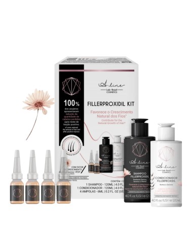 Le kit Fillerproxidil® contient : 1 shampooing (120 ml) + 1 après-shampooing (120 ml) + 4 ampoules (6 mL chacune).