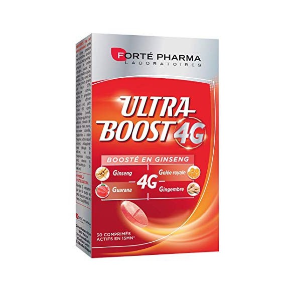 Ultra-boost 4g 30 comprimés à avaler de Forté Pharma est un complément alimentaire à base d'actifs d'origine naturelle agissant en synergie pour retrouver rapidement son énergie. Le complexe d'actifs 4g, constitué par le ginseng, le guarana, le gingembre et la gelée royale associé à la vitamine B5 qui contribue à réduire la fatigue. Afin de booster rapidement votre énergie, les comprimés à avaler bénéficient de la technologie adp (Advanced delivery procès) qui garantit la libération des actifs dans l'organisme en 15 minutes. Ultra-boost 4g peut se consommer ponctuellement ou en programme de 30 jours Renouvelable. Prendre 1 comprimé par jour le matin au petit-déjeuner avec un verre d'eau (200 ml).