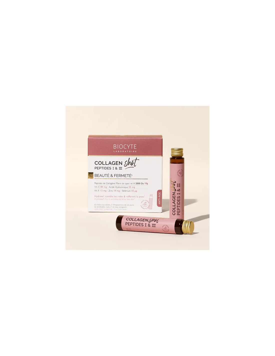 BiocyteHydrate (+23%), comble les rides (-9%) et raffermit la peau (+24%) grâce à une solution innovante en format shot, concentrée en collagène marin Naticol® et acide hyaluronique.