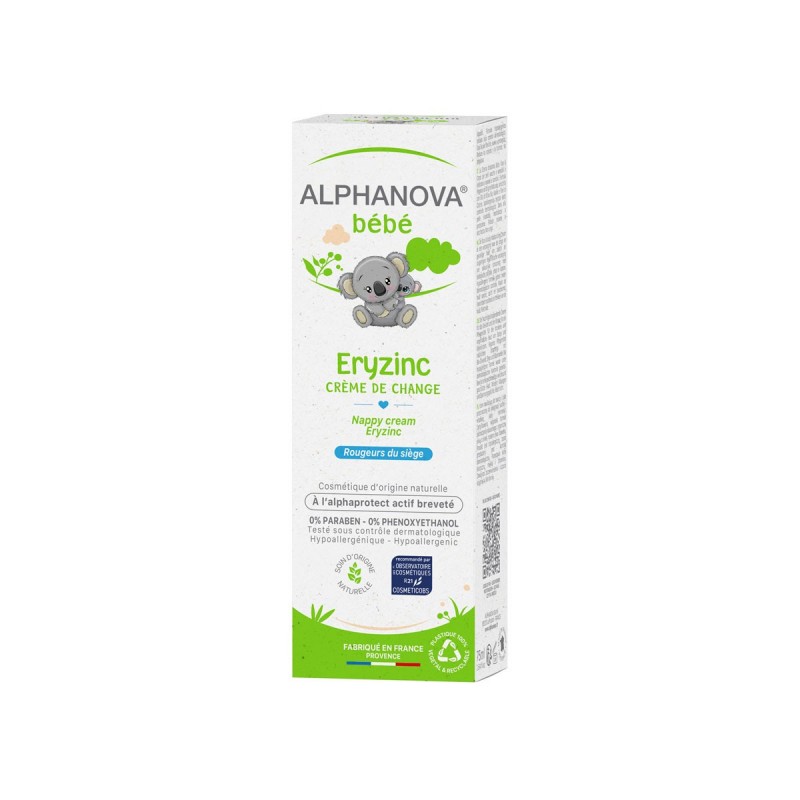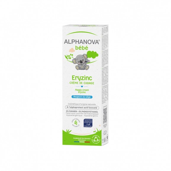 Eryzinc® d’ALPHANOVA bébé® prévient, apaise et répare les rougeurs du siège de bébé. Sa concentration élevée en Zinc lui confère des propriétés absorbantes et isolantes qui préviennent l’apparition des rougeurs. L’Alphaprotect, actif innovant breveté stimule la flore saprophyte et la protection naturelle de la peau de bébé. Sa formule naturelle est enrichie en huile d’amande douce apaisante, en centella asiatica et en allantoine qui favorisent une action réparatrice rapide de la peau irritée de bébé.