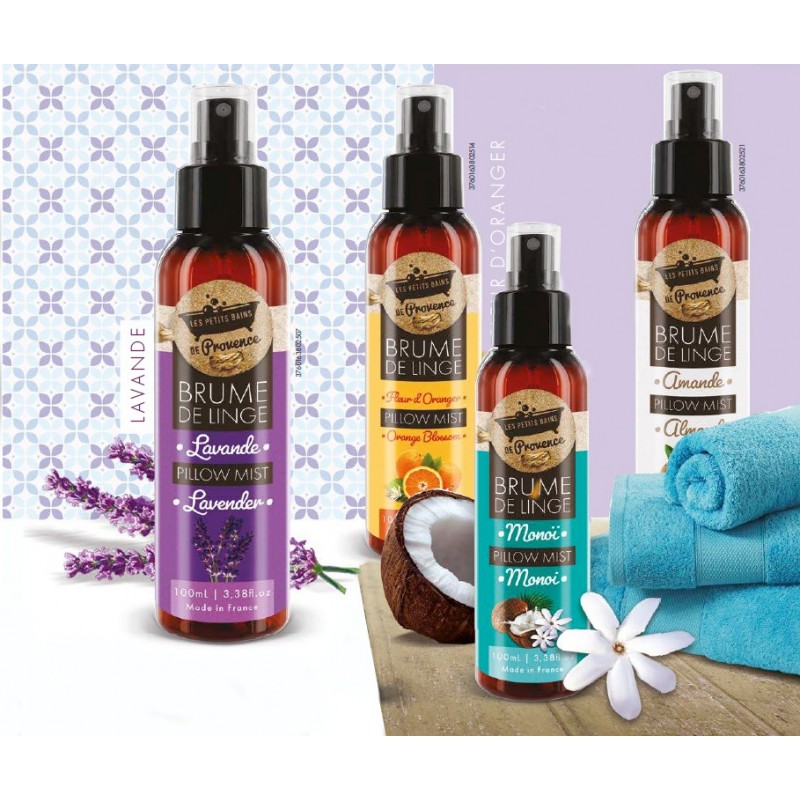 Les brumes de linge parfum fleur d'oranger Les Petits Bains de Provence parfument votre linge de maison, linge de bain, rideaux, canapés, et également vos draps, traversins et oreillers.