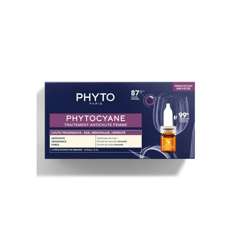 PhytoLe traitement antichute femme Phytocyane chute progressive est un protocole développé par la marque Phyto. Il est indiqué en cas de perte de cheveux liée à l'âge, l'hérédité ou la ménopause.