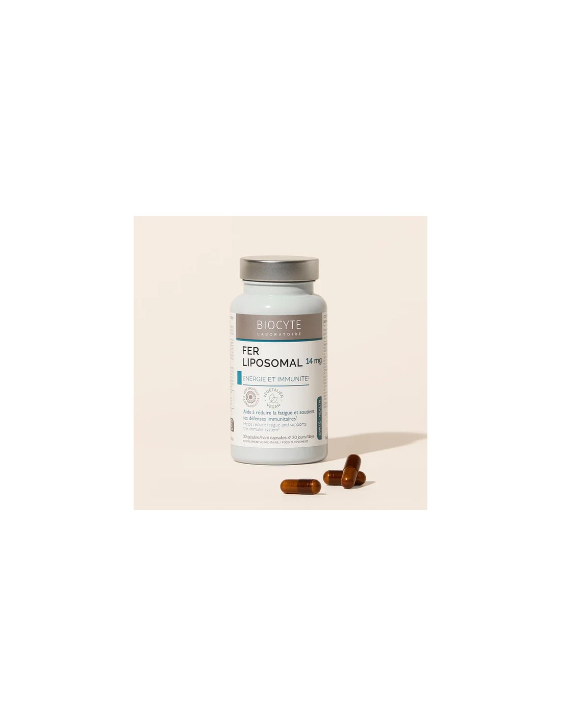 Le complément alimentaire Fer Liposomal de Biocyte est conçu pour soutenir l'énergie et le système immunitaire. Sa formule unique associe du fer microencapsulé, la vitamine C et la vitamine B12, offrant une synergie d'actifs pour une efficacité optimale. Le fer contribue à la formation normale de globules rouges et d'hémoglobine, essentiels pour le transport de l'oxygène dans le corps, tandis que la vitamine C améliore son absorption et la vitamine B12 participe à un métabolisme énergétique normal. Le fer microencapsulé utilisé dans ce produit est spécialement formulé pour une meilleure biodisponibilité, réduisant ainsi les inconforts digestifs souvent associés à la supplémentation en fer. Cette technologie innovante permet une libération contrôlée des actifs, maximisant leur efficacité. Fer Liposomal est idéal pour les personnes souhaitant réduire leur fatigue et renforcer leurs défenses immunitaires. Sa formule convient également aux végétariens et aux végétaliens, offrant une solution complète et adaptée à tous les régimes alimentaires.